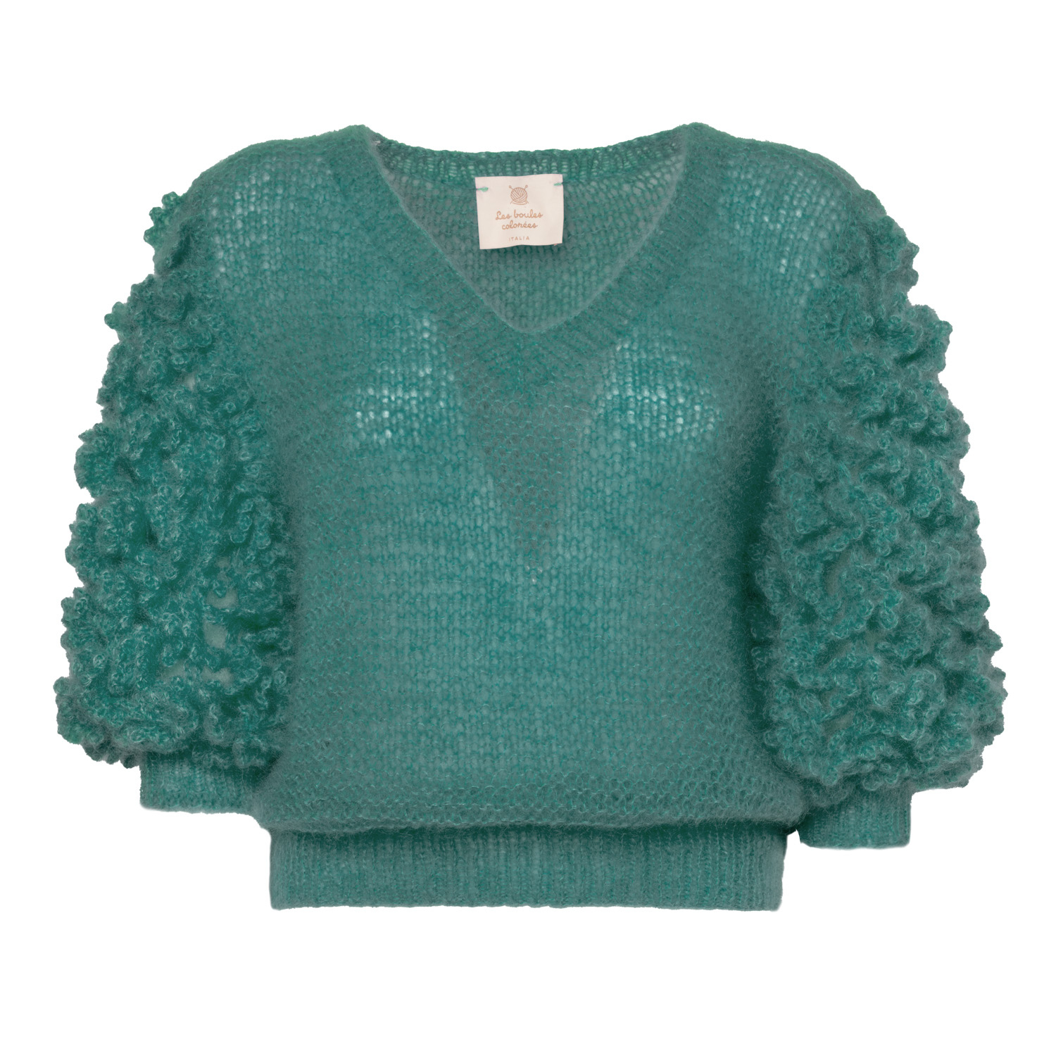 Un omaggio alla delicatezza della natura, Botan prende il nome dalla peonia, simbolo di eleganza e trasformazione. Realizzato in un filato pregiato composto al 70% da super kid mohair e al 30% da seta, Botan avvolge il corpo con leggerezza. Lavorazioni tridimensionali ispirate alla fioritura lungo le maniche, volumi mossi e texture arricciate che ricordano morbide increspature floreali.