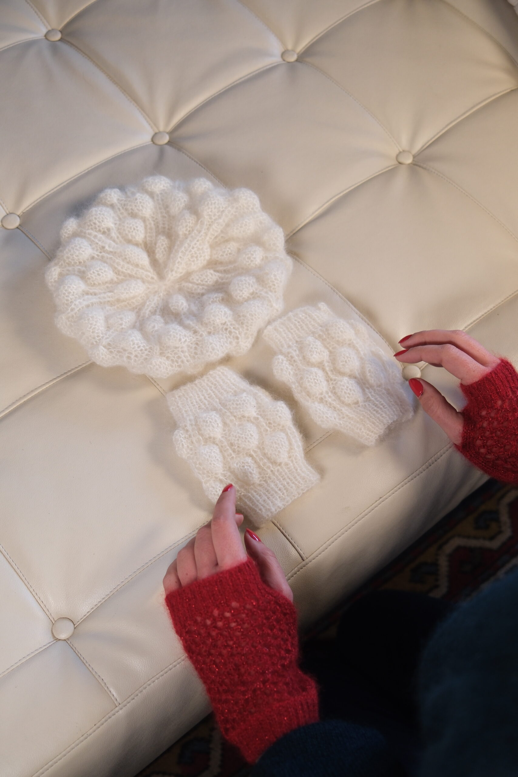 Il berretto Bubble completa la collezione con un tocco di charme. Morbidissimo e caldo, è lavorato interamente a mano con la stessa texture a bolle che caratterizza il maglione.