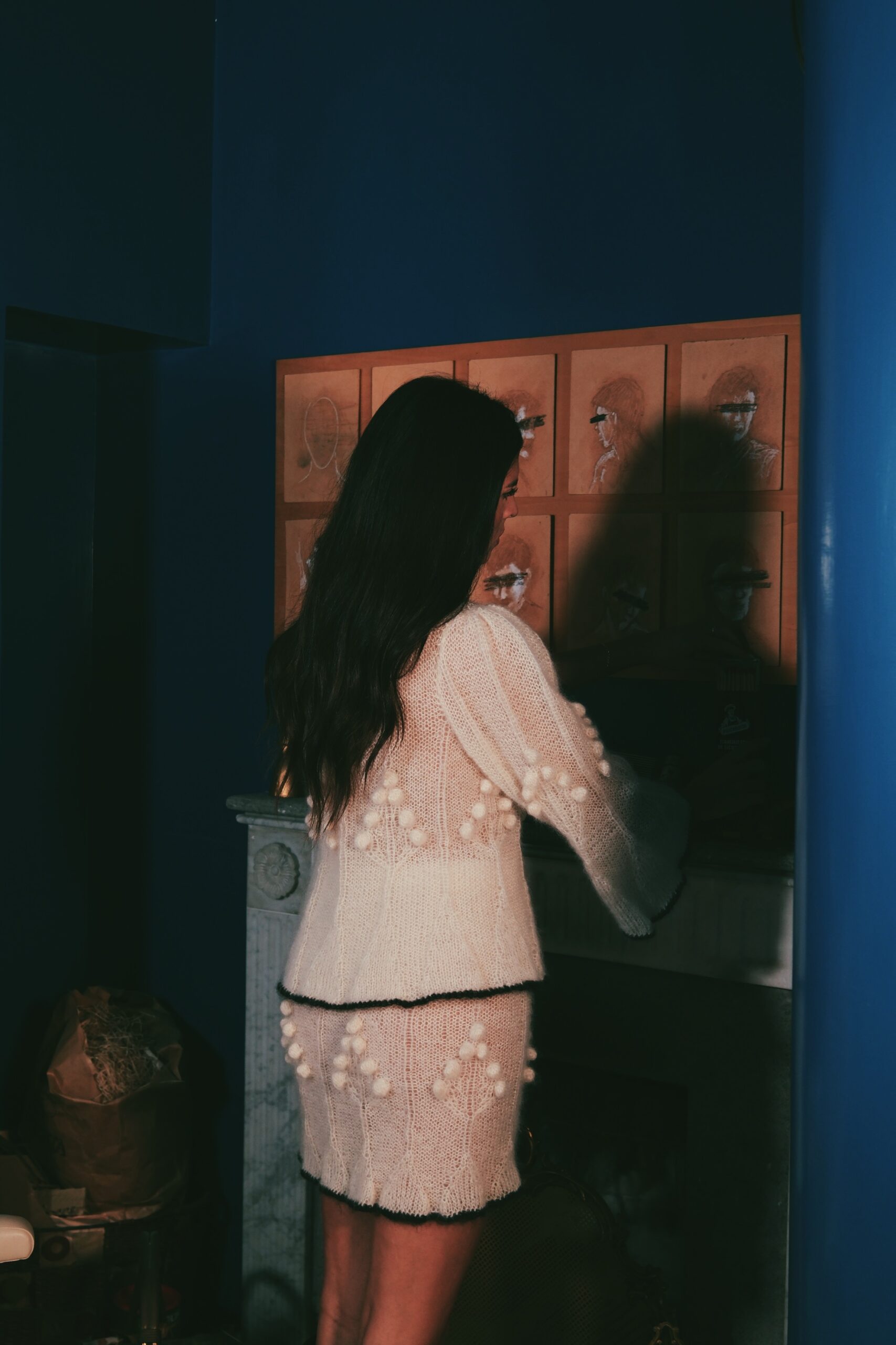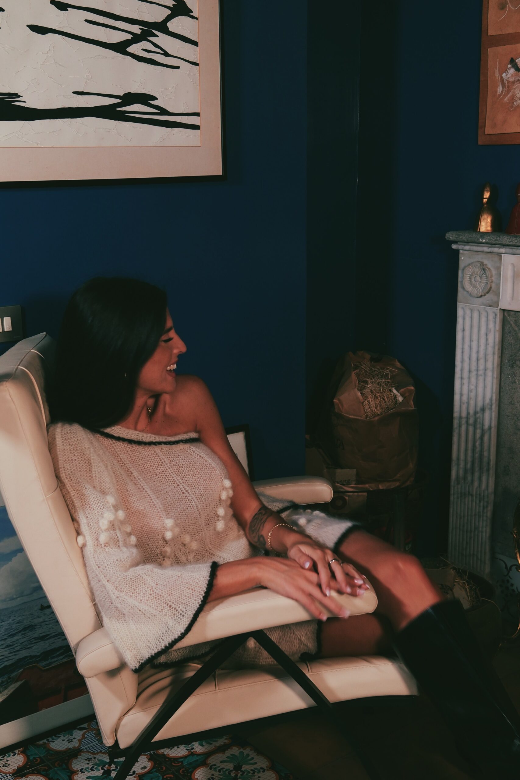 Romantica e decisa, la gonna Sospiro segue le forme con eleganza naturale. La trama in lana bianca, punteggiata da delicati rilievi fatti a mano, richiama la poesia dei dettagli imperfetti. Rifinita con un bordo nero a contrasto, dialoga con il top in un equilibrio di leggerezza e forza, come un respiro che resta nell’aria un istante in più.