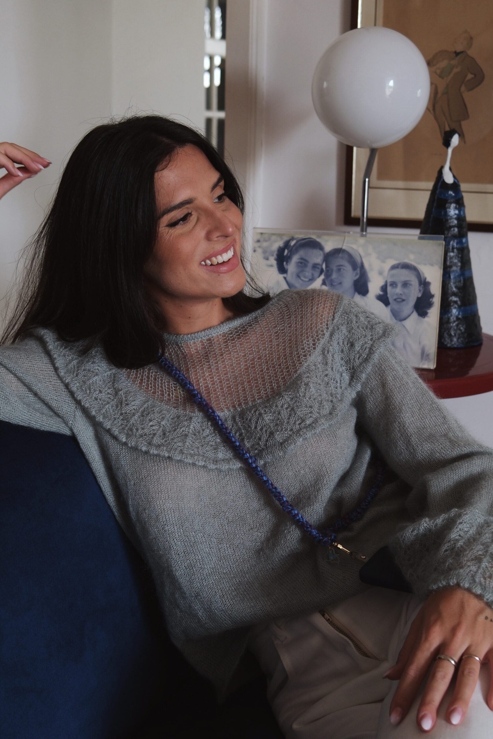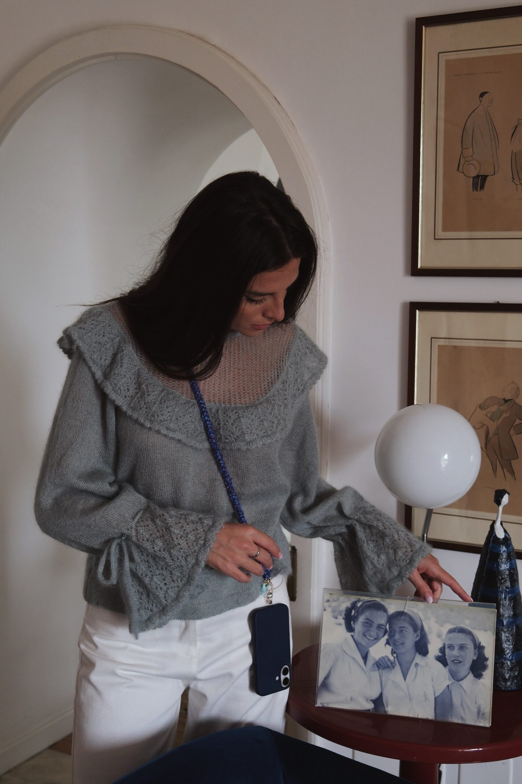 Realizzato a mano in un filato grigio perla, morbido e impalpabile come una carezza d’inverno. Il motivo traforato sullo scollo e sui polsini dona un’allure romantica, mentre le maniche ampie e i piccoli fiocchi laterali aggiungono un tocco di poesia contemporanea.