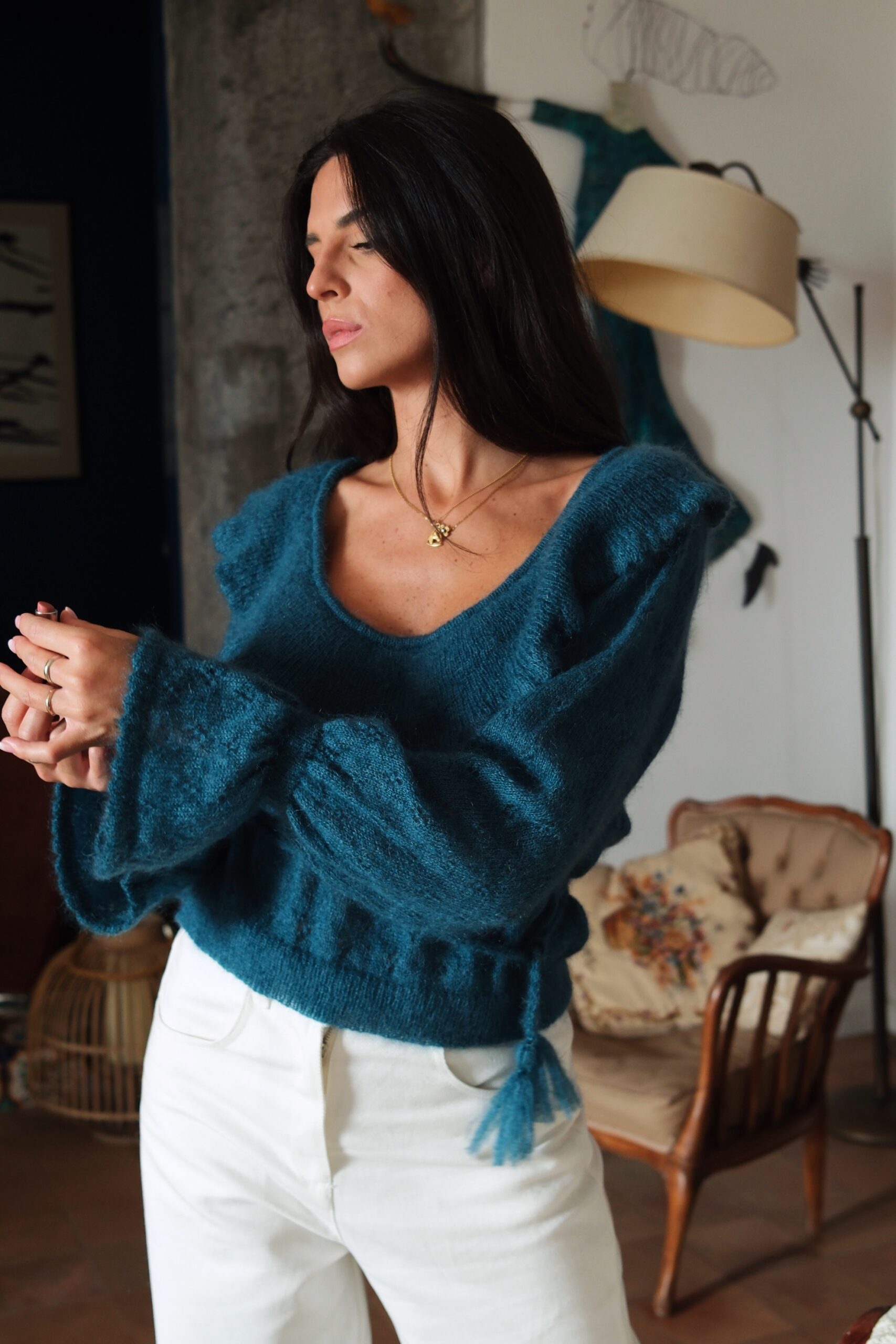 Étoile è realizzato a mano in un filato soffice e luminoso, dal tono profondo e sofisticato del blu petrolio.